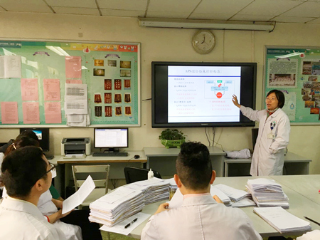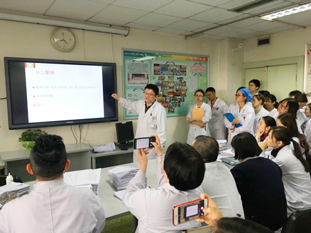 石华老师对一份产科特殊病例中磷脂相关抗体检测结果的问题与产科教授们进行了详细的交流,并讨论出进一步解决问题的方案。张鸽老师对D二聚体和FDP检测的作用进行了讲解,通过对一份产科病例检验结果的分析提出FDP检测的重要性,有利于筛除D二聚体检测假阴性或假阳性结果。两科老师们积极讨论问题,探讨解决之道,现场交流气氛热烈。