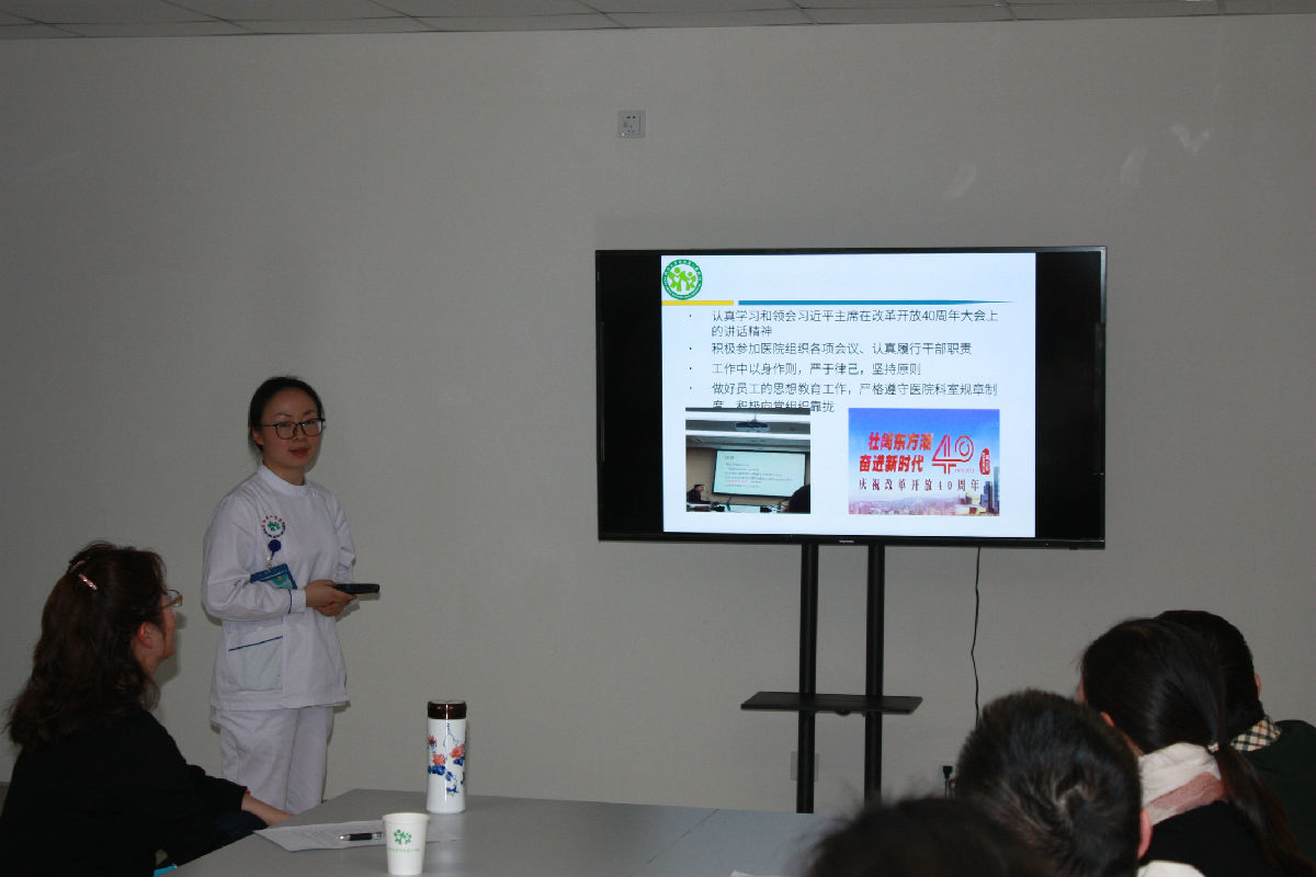 2019年1月8日下午16:00,按医院党委组织部要求,在锦江院区7楼示教室对产科试用期满干部进行期满述职测评,王晓东副院长、团委陈莉娟书记、院长办公室吴约成副主任参加会议。