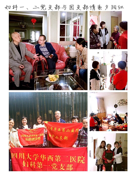 十月金秋,丹桂飘香,在一年一度的重阳节到来之际。10月26日上午,我院妇科党一支部书记李清丽,党二支部书记何跃东、组织委员王佳及团支部书记周琪敏携党团成员,分别走访了5名退休老职工,为他们送去了重阳佳节的慰问和全体职工的祝福。