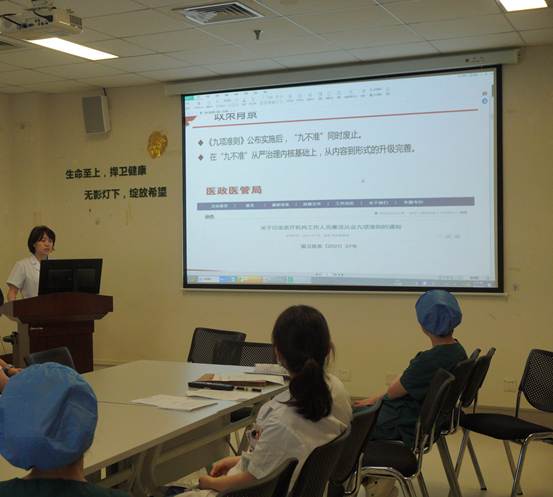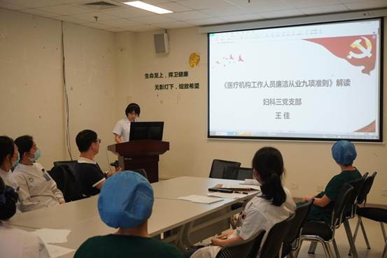为切实推进、落实医院全面从严治党和党风廉政建设相关工作安排,妇科三党支部于6月1日开展了“法纪同行”党风廉政及行风教育主题党日活动,20余名支部党员参加了活动,活动由党支部纪检委员、妇科特需病房护士长王佳主持,并从政策背景、具体内容、处罚与追责等方面领学了《医疗机构工作人员廉洁从业九项准则》;并号召全体党员同志“常修从医之德,常怀律己之心,常思贪欲之害,常戒非分之想”。