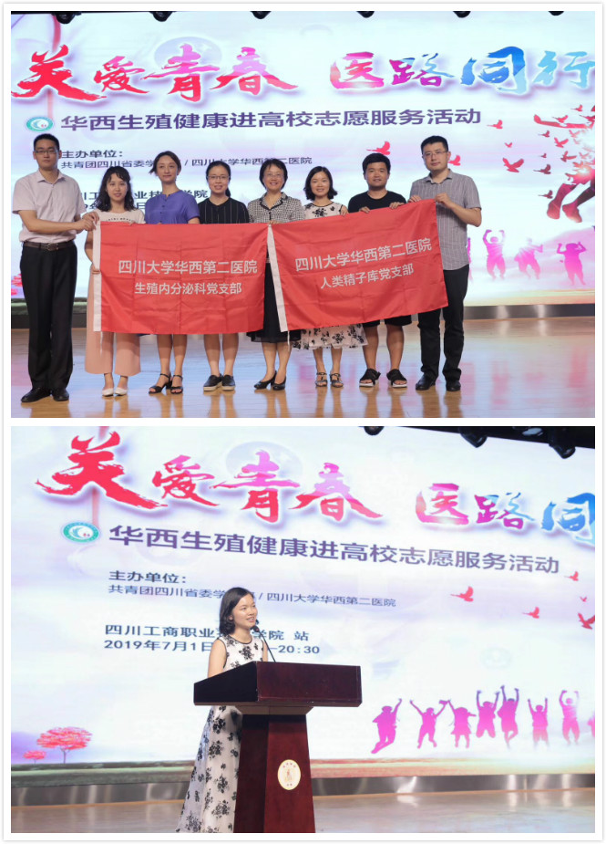 2019年7月1日,由共青团四川省委学校部,我院主办,共青团成都医学院委员会、我院宣传统战部、团委、男科/人类精子库、生殖内分泌科、生殖医学科、妇科门诊、四川工商职业技术学院承办的“The Way 关爱青春·医路同行”第八场——华西生殖健康进高校系列活动在四川工商职业技术学院举行,四川工商职业技术学院团委书记杨婧,我院宣传统战部主任王海英同志、团委书记陈莉娟同志、四川省人类精子库/男科李定明主治医师,组织部李悦同志,宣传统战部吴玉川一行出席,生殖内分泌科熊英主治医师,男科白恒舟医师进行了专题讲座,四川工商职业技术学院200多名师生参会。