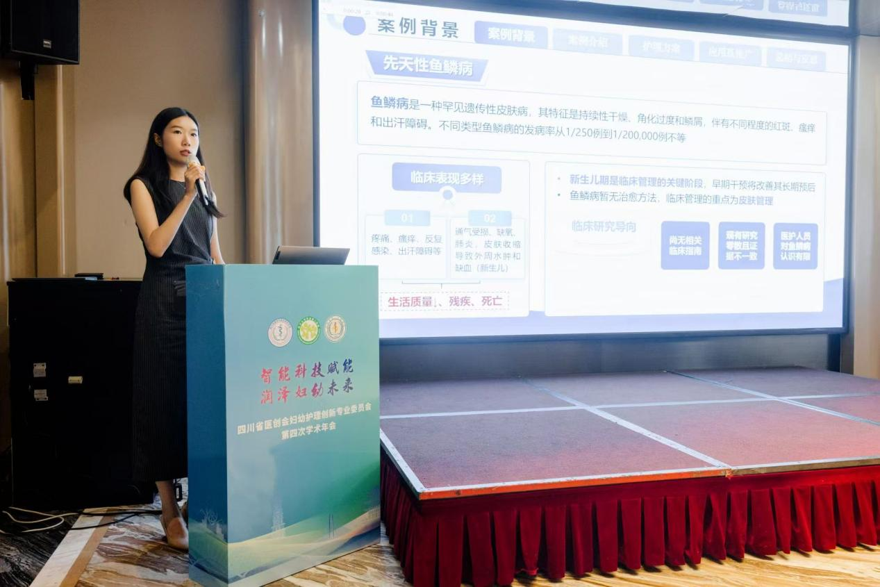 本次学术年会以“智能科技赋能,润泽妇幼未来” 为主题,汇聚全国 20 余个市州、50 余家医疗保健机构的 200 余名护理同仁,聚焦妇幼护理创新与学科发展。我院新生儿科青年护士李月作为案例汇报人,结合临床实践细节,系统分享了团队针对先天性鱼鳞病新生儿的循证护理方案——以 “FISH 原则”(病情评估、皮肤管理、并发症管理、社会心理支持)为核心,整合 12 篇高质量文献的 33 条最佳证据,通过分区域皮肤护理、感染精准防控、营养动态监测、藏汉双语家庭支持等措施,帮助患儿实现皮肤破损愈合、并发症治愈,最终顺利出院。汇报内容兼具科学性与人文性,充分展现了科室青年团队在党建引领下的专业素养与创新能力。