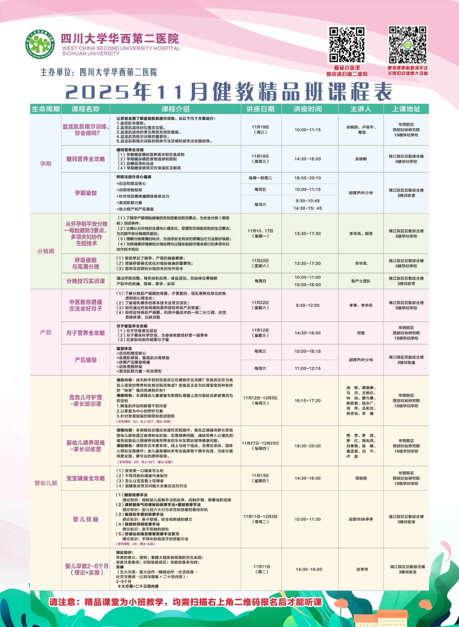 四川大学华西第二医院2025年11月健康教育精品班课程表